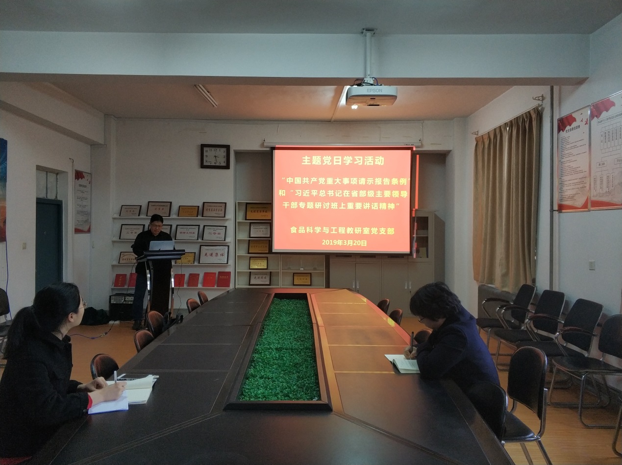 3月20日下午,食品科学与工程教研室党支部在学院党员活动室开展主题党日专题学习活动,会议由支部书记何云海主持。党日主题围绕《中国共产党重大事项请示报告条例》和“习近平总书记在省部级主要领导干部专题研讨班上重要讲话精神”进行专题学习。