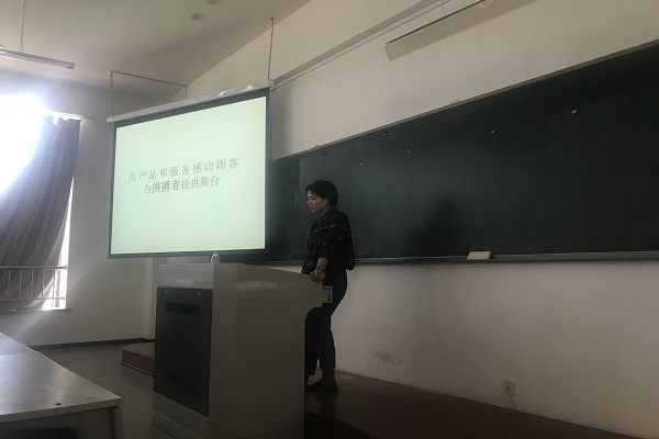招聘会上,李旭首先以一段视频让学生们了解到好利来的企业文化以及价值观—一个成功的公司是用爱来经营的。接着,她给同学们分享了公司中优秀人才的事例并结合自身的经历向我们展示了加入企业发展后的生活。最后她对招聘岗位、岗位待遇及企业生活环境等方面做了详细的介绍。
