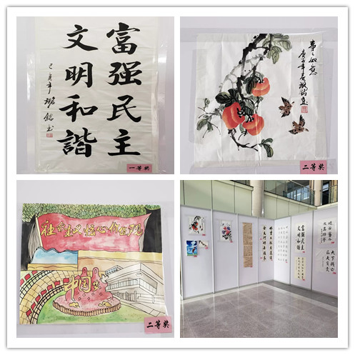 近日,由党委宣传部、校团委主办,海洋科技与环境学院承办的壮丽七十年 奋斗新时代“弘扬社会主义核心价值观”活动月主题书画比赛在獐子岛教学楼展出。我院共推送书画作品17副,其中质量2017级2班贾璐铭书法作品《社会主义核心价值观》荣获一等奖,绘画作品《事事如意》荣获二等奖;2018级英才班耿文豪绘画作品《中国梦》荣获二等奖。