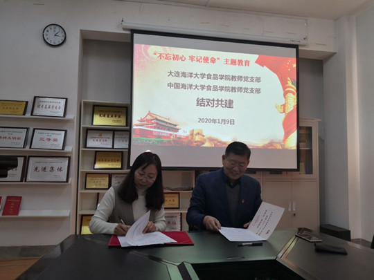 2020年1月9日,我院教工党支部(以下简称“食品教工党支部”)在学院会议室与中国海洋大学食品科学工程学院教师第一党支部(以下简称“教师第一党支部”)签署了“党支部结对共建协议”。学院党总支书记高璐璐、院长赵前程、教师第一党支部书记林洪,食品教工党员出席此次活动。