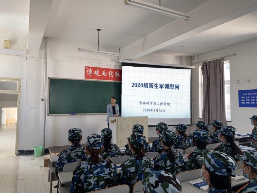 在中秋、国庆双节来临之际,学院党总支书记高璐璐、副书记武家春和团委书记唐珏于9月30日上午来到2020级新生军训现场,亲切慰问了参训学生和承训教官,详细了解军训期间同学们的训练和生活情况,并送来了节日祝福及学院烘焙社团自制的美味月饼。