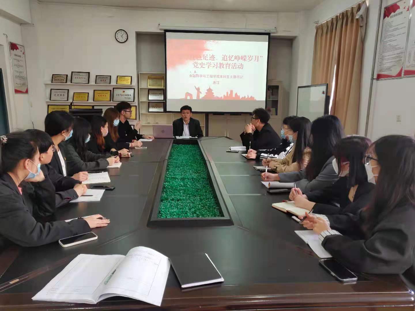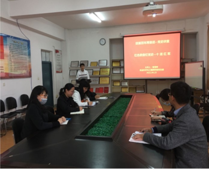 食品科学与工程教研室党支部于4月23日开展了红色歌曲忆党史的党课。本次党课扩大到教研室老师,支部党员鲁雪峰详细介绍了《十送红军》歌曲创作背景、词曲作者和价值意义,带领大家共同欣赏了优美的歌曲。这首歌曲情深意切地传达了大众的心声,支部党员及各位教师更深切理解了军民鱼水情。