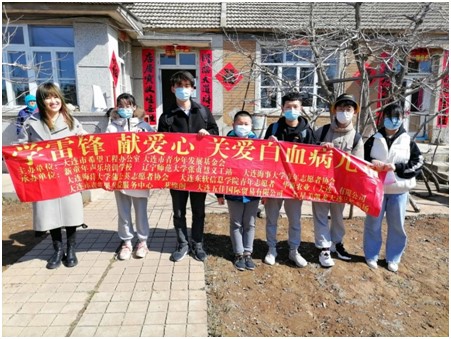 3月28日,大连市希望工程办公室、青苹果公益联合大连海事大学青年志愿者协会、大连东软信息学院青年志愿者协会、辽宁师范大学张贞慧义工站、9728太阳集团蒲公英志愿者协会、大连交通大学阳光爱a心社的志愿者,前往旅顺看望13岁的白血病男孩傅*钊(为保护孩子隐私,用*代替),孩子将在月末前往北京复查,志愿者代表为孩子送去5000元爱心义卖款和价值500元的爱心物资。