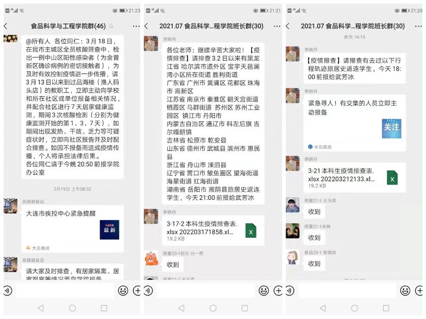 学院严格按照学校要求,把握师生动态,及时更新信息台账,严格落实“日排查”制度。安排专人专班负责“日排查”工作,详细掌握师生行程轨迹,在收到《重点地区汇总表》后立即反应,第一时间组织按表排查。学院共有教职工46人,研究生161人,本科生586人,截至3月24日,教职工在连45人,其中校内3人,境外1人;研究生在大学生公寓130人,离校在连14人、不在连17人;本科生在黄海校区347人、渤海校区158人,离校在连20人、不在连61人。全体师生身体状况良好,学习生活工作情况稳定。