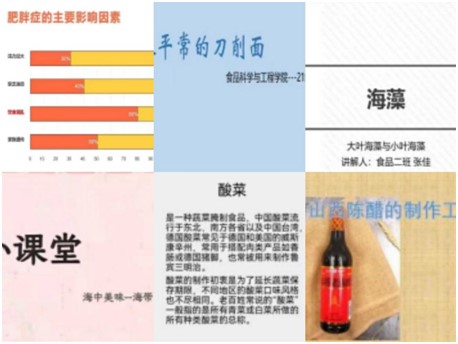 此次活动当中,6位同学利用PPT和视频,分别从饮食对肥胖症的影响、大叶海藻与小叶海藻的区别与营养价值、刀削面的制作工艺、海带的生产与加工、酸菜的制作过程、山西陈醋的制作工艺等六个方面做了详细介绍,让大家更加深入地了解了食物原材料的生长、美食的制作过程、营养成分以及对人体健康的影响。6名同学PPT制作简洁精美,讲解表述清晰,同学们受益匪浅。