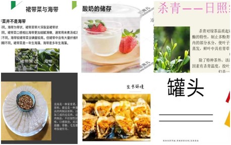 活动中六名同学通过PPT和视频分别为同学们介绍了裙带菜与海带的区别、酸奶的制作与储存、茶叶的价值及功效、猪皮冻的制作工艺、生蚝的种类及营养价值、罐头的制作工艺及优缺点等方面食品相关知识。6名同学课件制作简洁精美,讲解表述清晰,同学们受益匪浅。