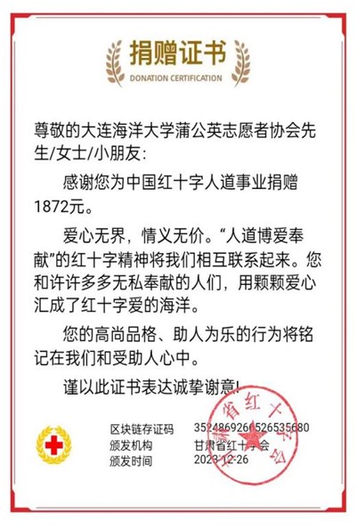 晚会中,蒲公英志愿者协会为甘肃地震受灾地区举办了爱心演讲和募捐活动,募集资金1872元并捐献给甘肃省红十字会,为灾区献出绵薄之力。