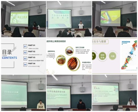 活动中,聂羽禾等10名同学分别从食品安全问题现状、食品安全问题解决策略和共筑健康饮食防线等三个方面对我国目前的食品安全现状进行了分享交流。同学们的课件制作简洁精美,分享表述清晰,让更多的同学们了解了食品安全不仅关系到人民群众的身体健康和生命安全,也是社会和谐稳定的重要保障。学生会学生干部对参加汇报的同学进行打分,并提出了建议和意见。