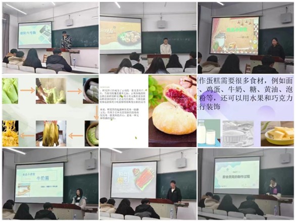 活动中,魏毓瑶等20名同学以PPT汇报的形式,对家乡的特色美食制作进行了分享,主要介绍了甘肃“豆汁”浆水面、朝阳“六号肠”、麻婆豆腐和重庆火锅等具有地方特色的美食。他们从食物的历史源流、制作过程、食用建议及功效与作用等方面进行生动有趣的讲解,配合精美的图片展示,成功吸引了同学们的眼球。通过这些同学的讲解,其他同学们不仅了解到了家乡美食的制作工艺和独特风味,更在品味美食的过程中感受到了家乡的文化和历史。
