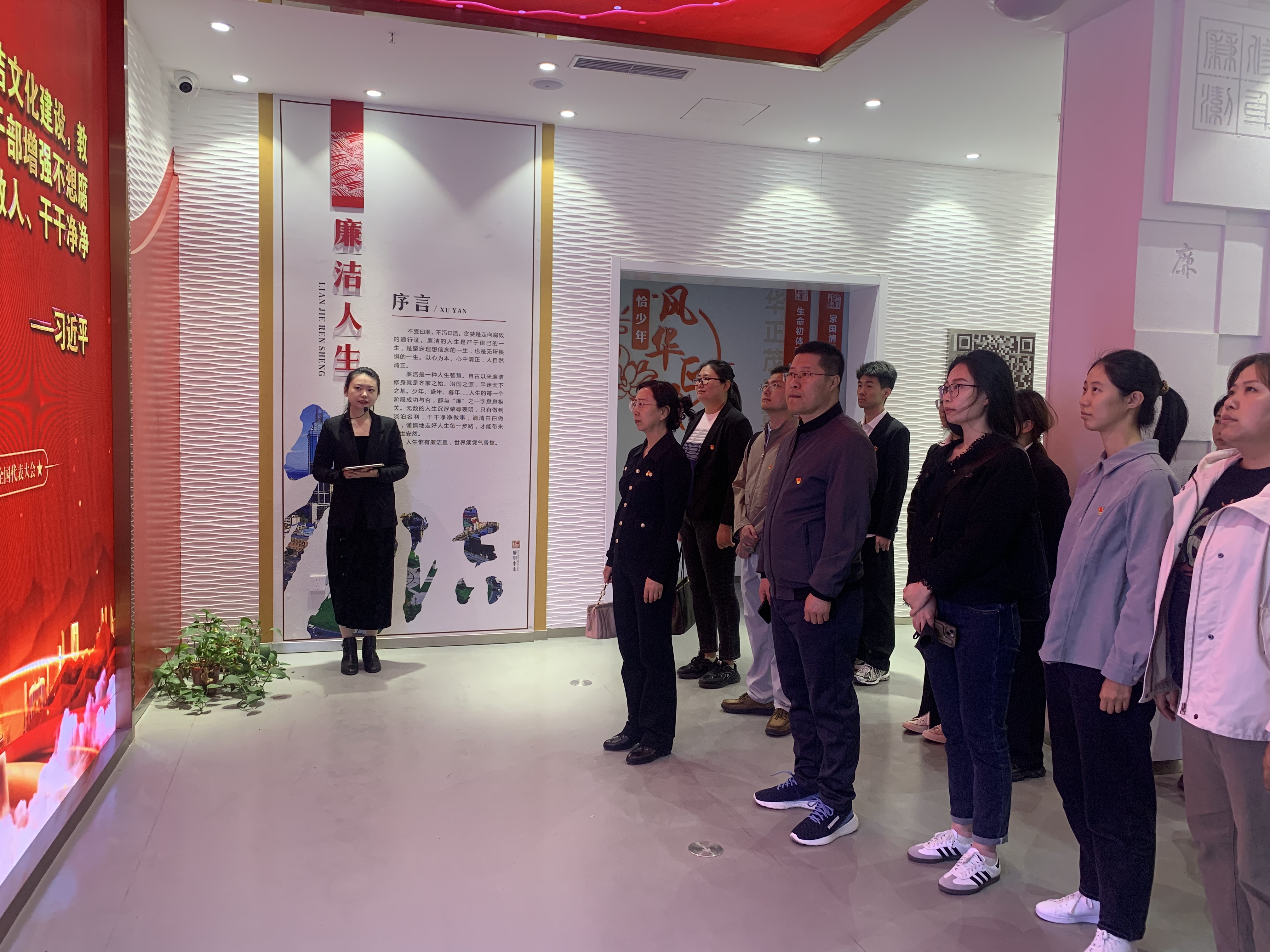 在廉洁人生体验馆,全体党员共同观看了宣传短片《墨梅》,谨记习近平总书记关于“不要人夸好颜色,只留清气满乾坤”的谆谆教导;参观了“恰少年,风华正茂”展厅、“正盛年,奋发有为”展厅、“惜尊年,不辱使命”展厅,在一幅幅历史画卷、一位位模范人物、一个个交互体验中,切身感受红色文化与廉洁文化在不同人生阶段的丰富内涵和价值意蕴。