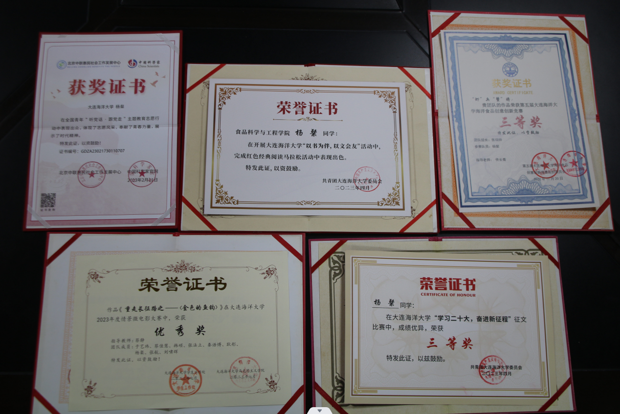 曾获得2022年辽宁省大学生食品创新大赛三等奖,2023年9728太阳集团“互联网+”大学生创新创业大赛二等奖,2023年9728太阳集团食品创新大赛优秀奖,2023年9728太阳集团“学习二十大,奋进新征程”征文比赛三等奖,2023年9728太阳集团第二届授课大赛优秀奖,辽宁省第二届大中小学师生书法大赛优秀奖等多项荣誉。
