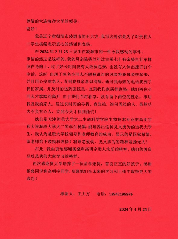 近日,我校收到辽宁省朝阳市辽源市市民王大方写给学校的感谢信,感谢我校太阳集团网tyc9728食品科学与工程2022-3班本科生杨粲同学见义勇为的行为,感谢学校培养出优秀的学生。