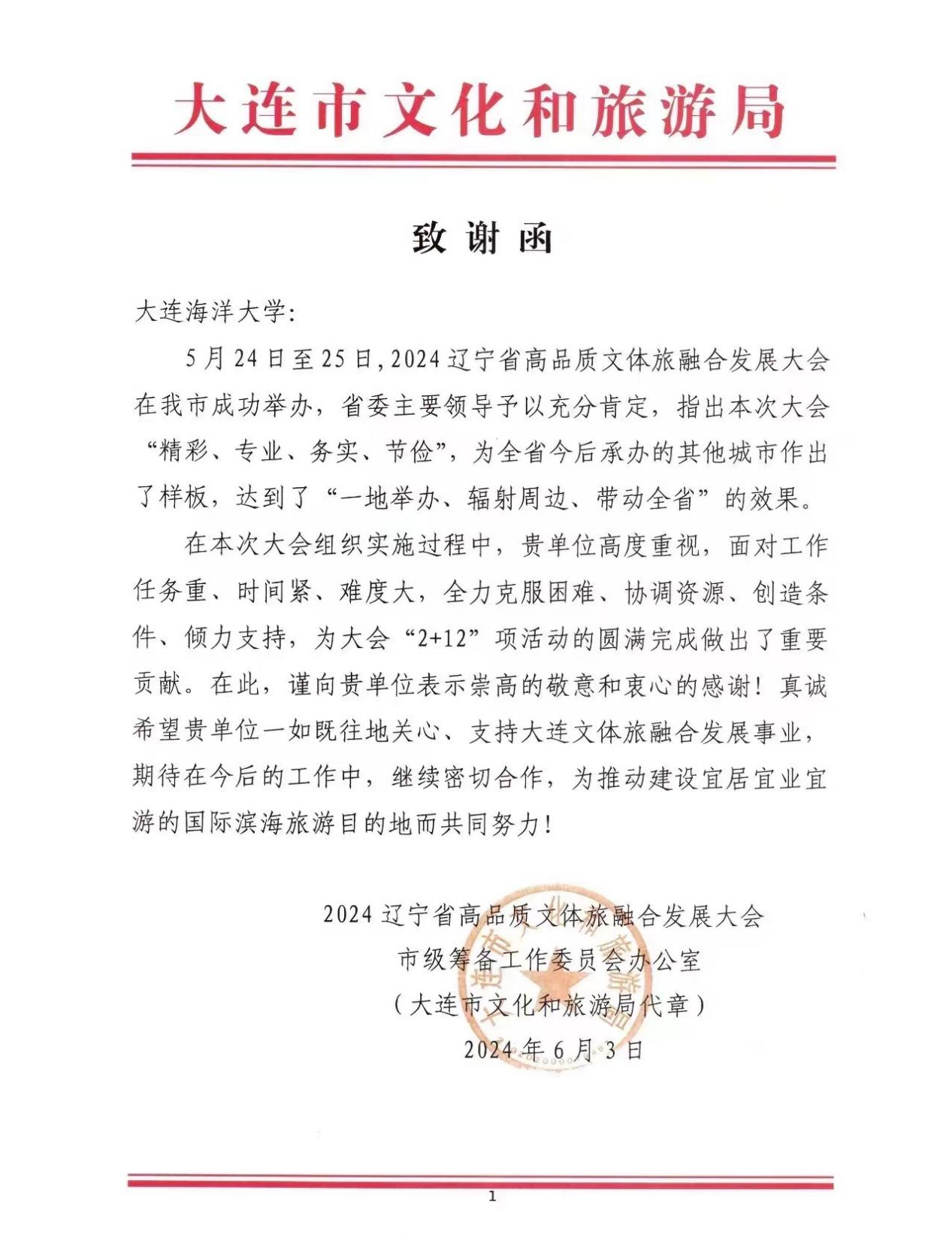 5月19-26日,由辽宁省人民政府举办、大连市政府承办的辽宁省高品质文体局融合发展大会在大连市召开。我校校团委、太阳集团网tyc9728“公益码头”辅导员工作室招募了140余名学生志愿者,组织开展志愿服务工作。此次志愿服务获得了大会筹办工作委员会、大连市文化和旅游局的肯定,并发来致谢函以表彰我校在本次志愿服务工作的突出贡献。