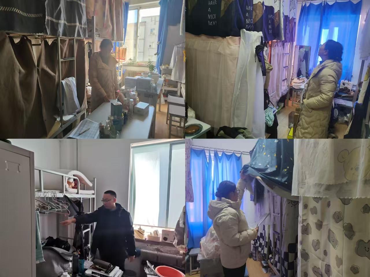 老师们对宿舍卫生、消防设施、用电安全、插排断电、门窗上锁情况进行仔细检查。对于仍未离校的同学,嘱咐学生离校前关闭宿舍电源、锁好门窗,回家途中注意人身和财产安全。
