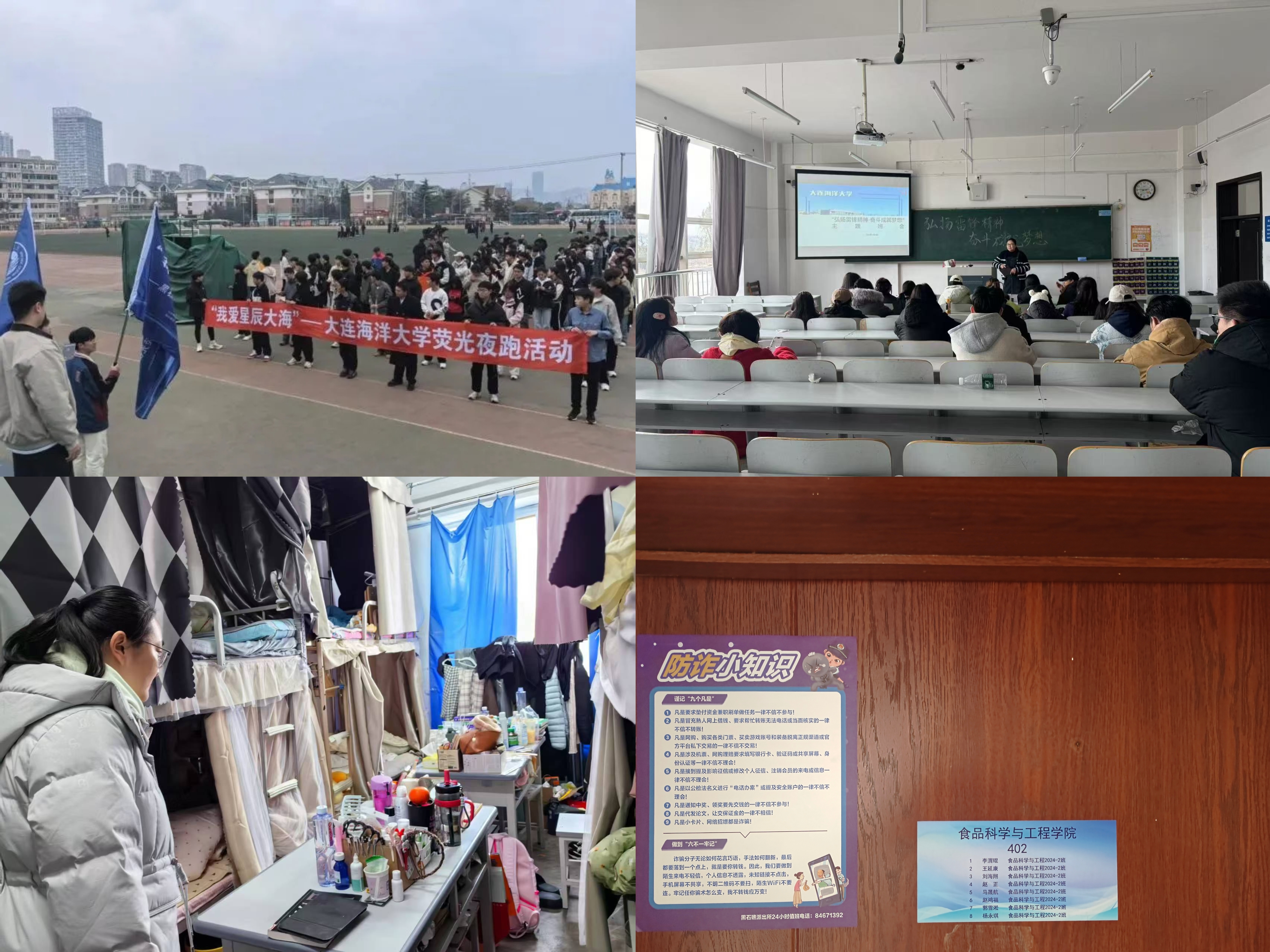 36日,学院开展卫生安全检查,覆盖全院102间宿舍,及时排查了宿舍安全隐患,提升了宿舍卫生水平。314日,开展“防诈骗安全教育”活动,通过案例分享的形式引导学生提升防诈骗意识,组织全院学生下载“反诈APP”,宿舍门口张贴反诈提示,进一步提高了学生对电信网络诈骗的甄别能力。315日,学院开展春季学期学生线下春季心理健康普查,提升学生心理健康意识。318日,学院组织全体学生观看消防公开课直播视频,提高学生消防安全意识,保障校园安全稳定。326日,学院50余名学生参与学校心理中心组织的“我爱星辰大海”荧光夜跑活动,以脚步释放压力,用汗水润泽心灵。