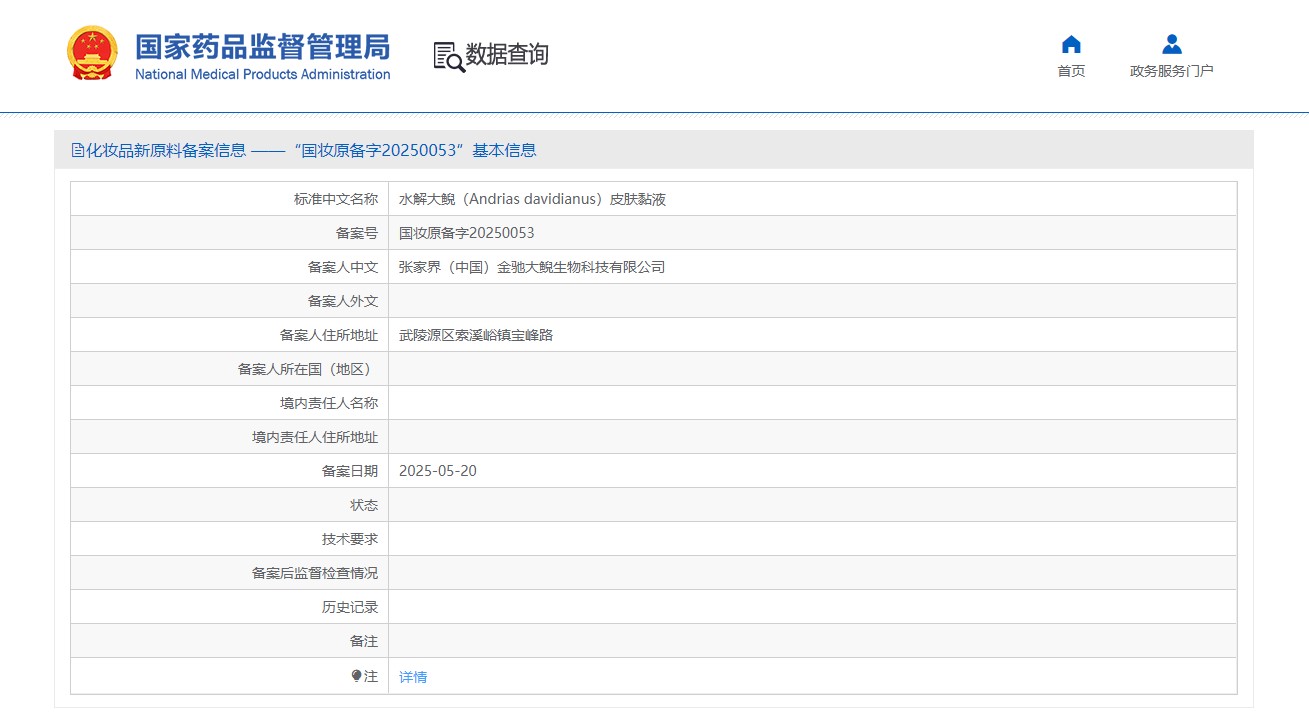2025520日,国家药品监督管理局化妆品原料备案平台公布,由我院佟长青教授团队主导研发、张家界(中国)金驰大鲵生物科技有限公司申报的“水解大鲵(Andrias davidianus)皮肤黏液”新原料成功通过备案(备案号:国妆原备字20250053)。这是我国首个获批的大鲵来源化妆品新原料,标志着珍稀水生生物资源高值化利用取得突破性进展。