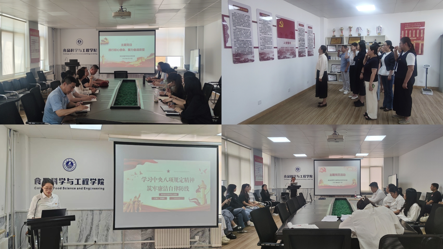食品科学与工程系党支部书记周慧讲授《学习领会和贯彻执行中央八项规定及其实施细则精神》主题党课,从中央八项规定及其实施细则出台的背景与意义、核心内容、具体要求与实践路径以及警示教育案例进行了全面解读。食品质量与安全系党支部书记曲敏讲授《以作风建设新成效开创高质量发展新局面》主题党课,从历史站位、历史史实、文化站位、战略站位、高等教育发展、教育强国以及高质量发展七个层面,从历史到当下全方位将作风建设与高等学校教育发展结合起来。本科生党支部书记李晓丹讲授《学习中央八项规定精神 筑牢廉洁自律防线》主题党课,从中央八项规定的发展历程、八项规定及80条清单主要内容、持续推进作风建设常态化长效化进行解读,促进本科生党员提升党性修养与规矩意识,将作风建设融入专业学习和日常行为之中。研究生党支部书记车盈讲授《学习领会和贯彻执行中央八项规定及其实施细则精神》专题党课,详细讲解了中央八项规定的内涵和精神实质,并强调纠治“四风”是新时代加强作风建设的重点任务。党课后还组织开展了重温入党誓词。