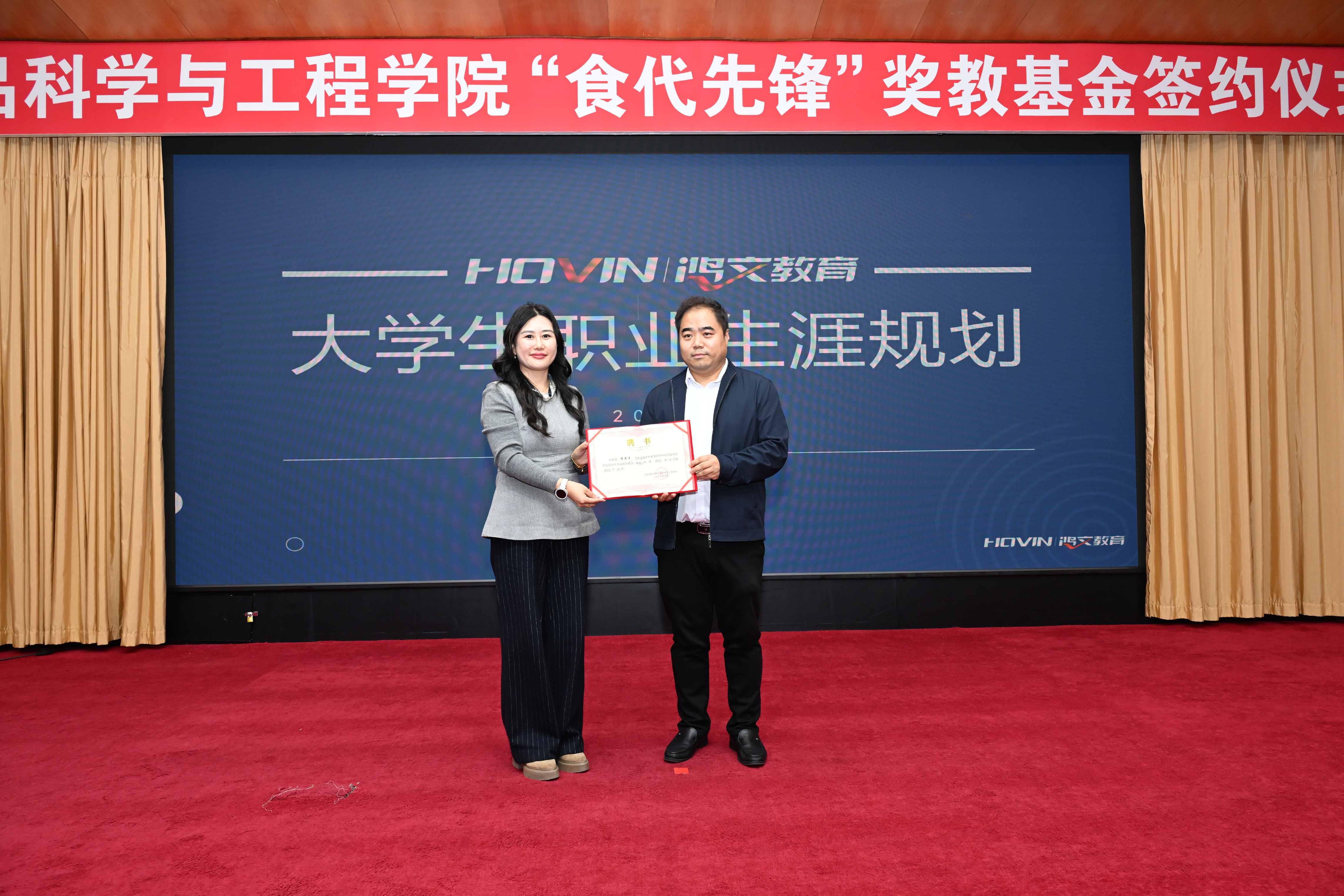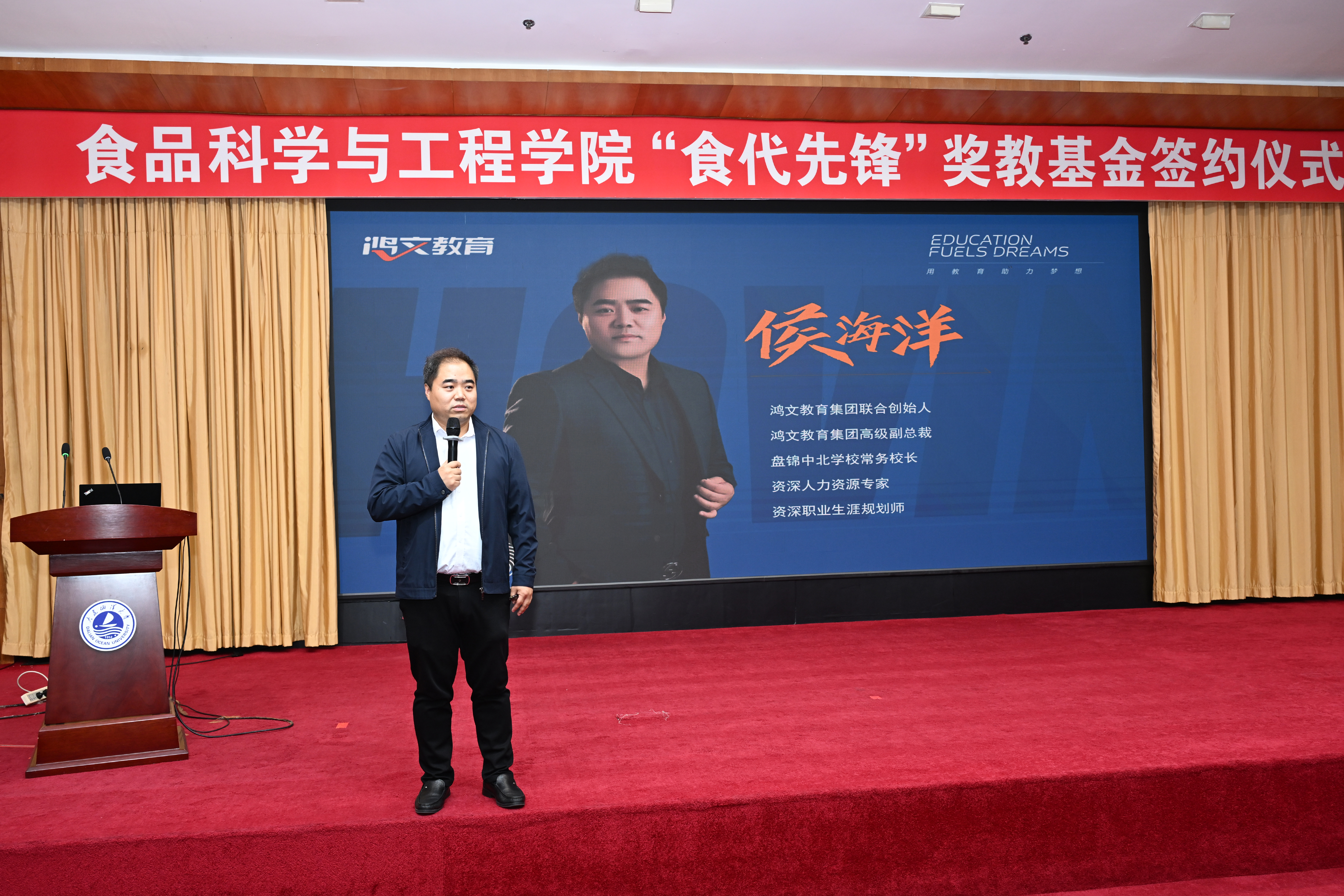 10月28日,我院在图书馆报告厅举办了“食代先锋”讲坛第一期暨大学生职业生涯规划讲座。鸿文世纪教育集团副总裁、盘锦中北学校常务校长、2011届杰出校友侯海洋受邀出席,并作了题为“做好职业规划 享受精彩人生”的专题讲座。学院党委书记张潇月、副书记武家春、辅导员佟婧绮以及2025级全体本科生共同参与了此次讲座。
