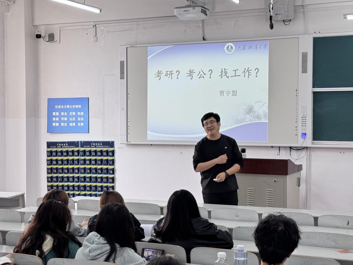 1112日,我院在獐子岛教学楼231教室举办“食代先锋”讲坛第二期暨大学生职业生涯规划专题讲座。本次讲座邀请大连交通大学教师贾宇盟老师主讲,学院党委副书记武家春、辅导员佟婧绮以及2024级全体本科生共同参与。